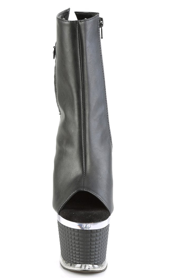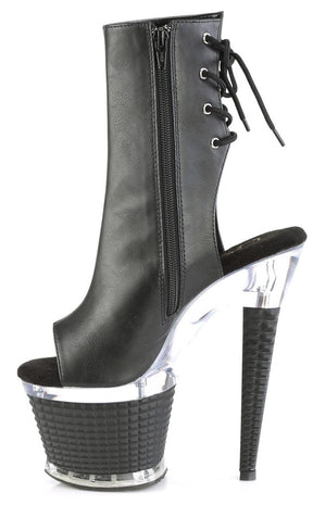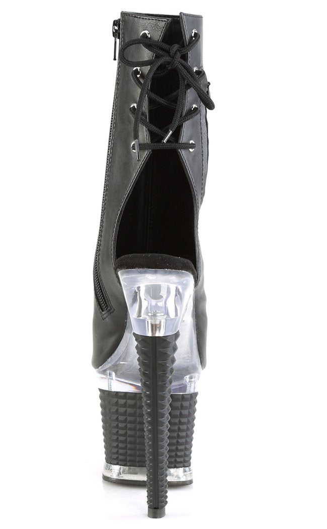 You're a one-woman show, baby! The SPECTATOR-1018 ankle booties feature a vegan black matte upper with a peep toe, ankle cutouts, rear lace-up and side zip. The heel and platform are topped by a clear panel above a 3D stud look wrapping.
