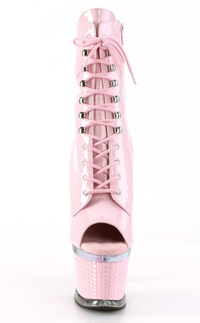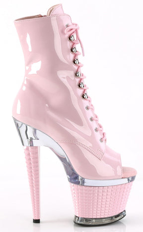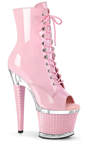 You're a one-woman show, baby! The SPECTATOR-1021 ankle booties feature a vegan baby pink patent upper with a peep toe, lace-up and side zip. The heel and platform are topped by a clear panel above a 3D stud look wrapping.