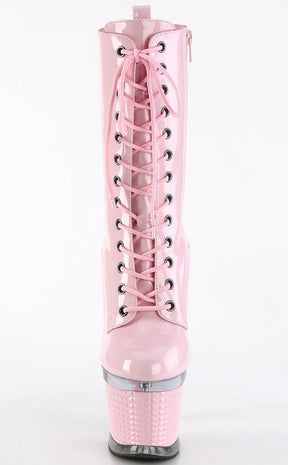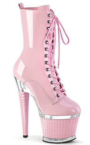 You're a one-woman show, baby! The SPECTATOR-1040 ankle boots feature a vegan baby pink patent upper that secures with a lace-up and side zip. The heel and platform are topped by a clear panel above a 3D stud look wrapping.