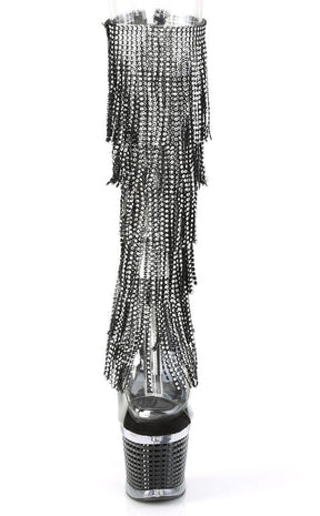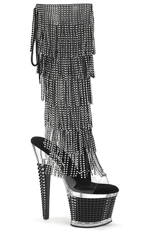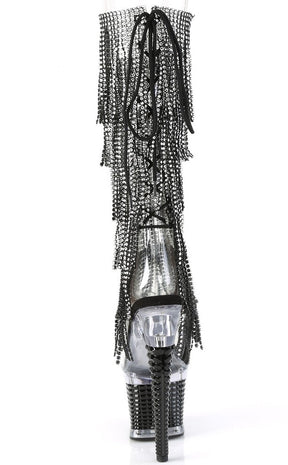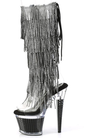 You're a one-woman show, baby! The SPECTATOR-2017 knee-high boots feature a clear upper with 6 layers of chrome rhinestone fringes that secures with a rear lace-up and inner zip. The platform and heel feature a clear segment on top of a stud effect panel.