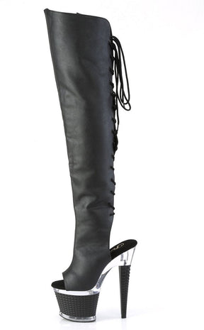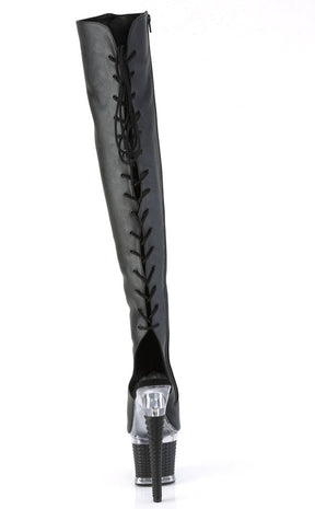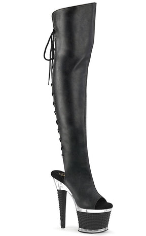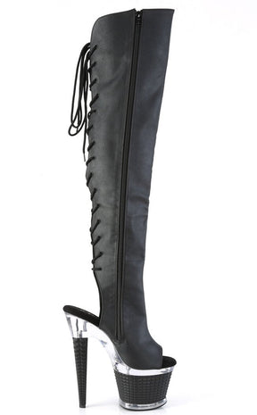 You're a one-woman show, baby! The SPECTATOR-3019 thigh-high boots feature a black matte upper with a peep toe and ankle cutout that secures with a rear lace-up and inner zip. The platform and heel feature a clear segment on top of a stud effect panel.