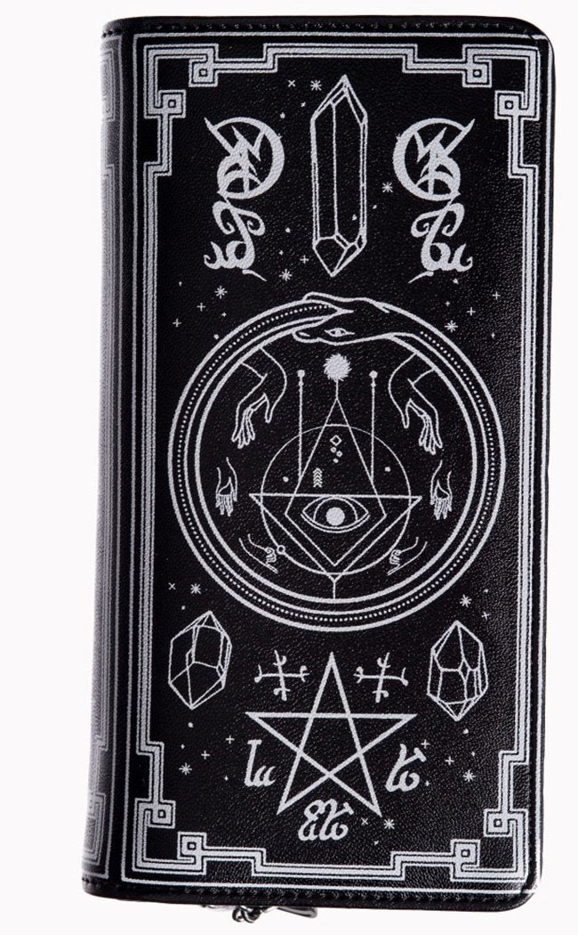 This witchy wallet is shaped after a book, featuring bold, occult artwork and wicked symbols. It fastens with a zip, opening to reveal plenty of space for your cards including a zip compartment for change.