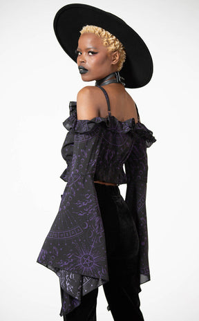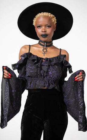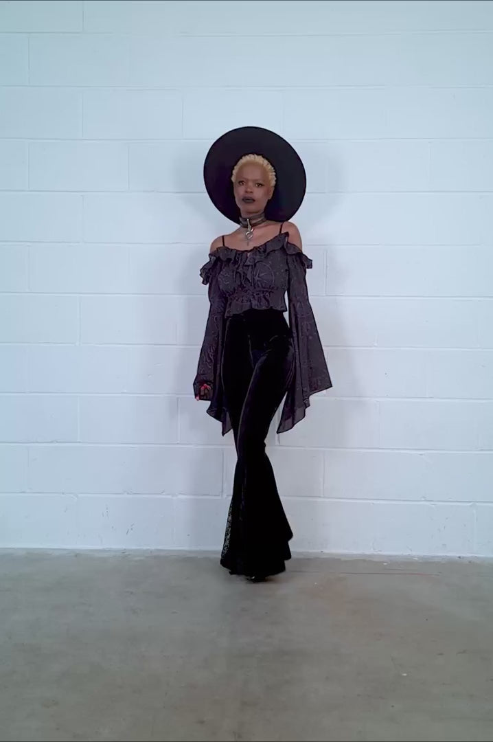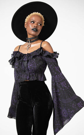 Tell their misfortunes in the Spirit Hand Chiffon Top! >Soft, lightly stretchy black mesh is printed with a custom celestial print to have ya feeling like a lunar goddess. This forms exquisite details like ruffled trims, a lace-up neckline and bell sleeves on this gorgeous bardot top.