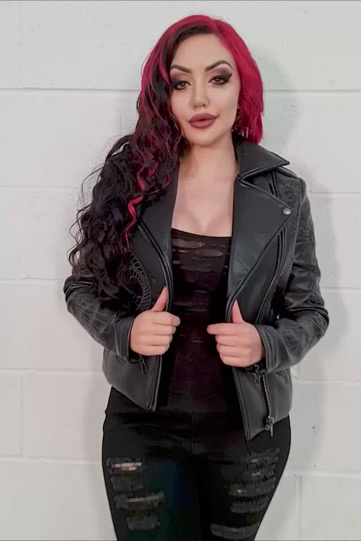 Ride into the night sky in this stunning piece of outerwear! Made with luxury vegan leather embroidered with meticulous detail and stellar motifs, this jacket is yer classic biker with a twist. Buckle details and an exaggerated collar with have you feeling badass, securing with a front zip for easy on/off.