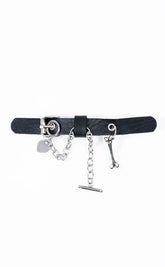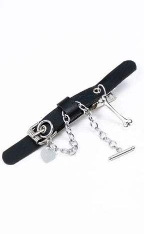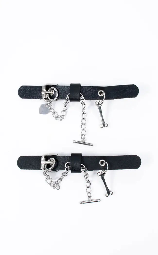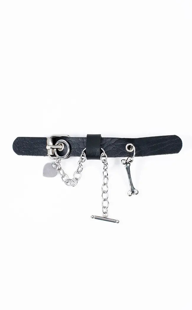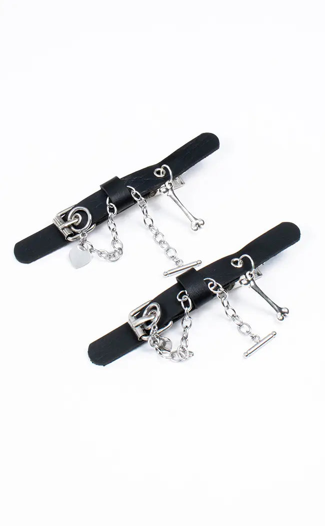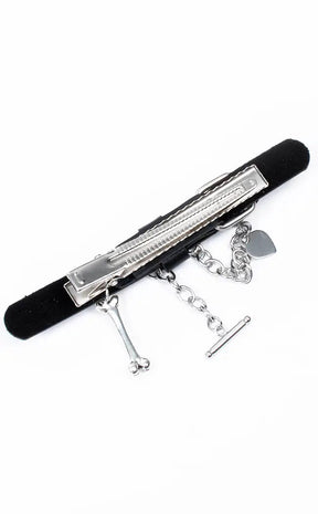 - Features: Alligator clip, dangling bone & chain with small heart motif