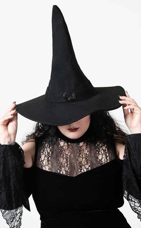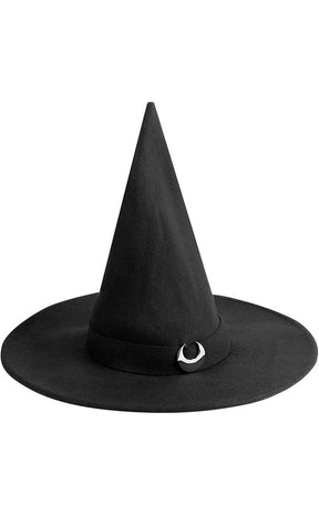 Scratch yer witchcraft itch with the Super Moon Witches Hat! This statement hat features a tall, tapered point, a wide brim and a black metal crescent moon decal.