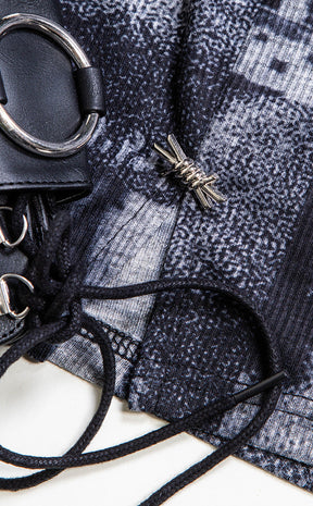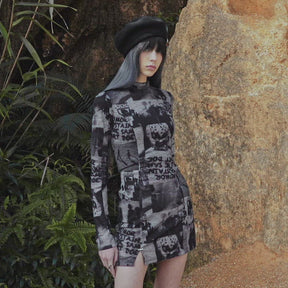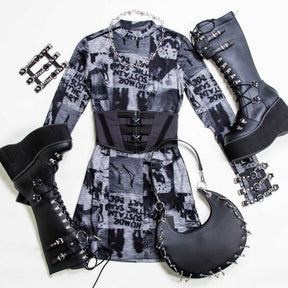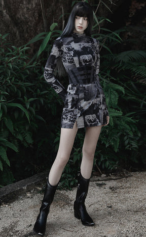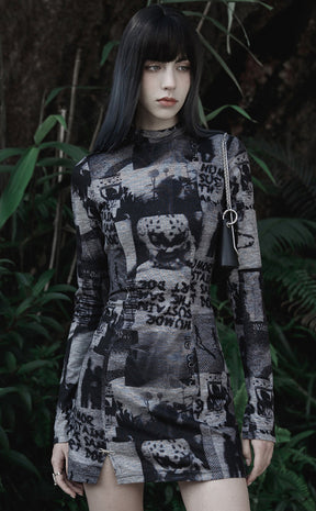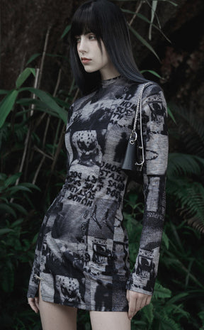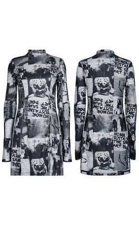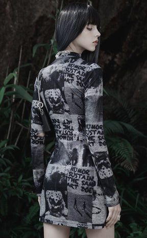 Make the front page in the Tabloid Fodder Dress! Made from super soft fabric with a poster effect print, this dress features long sleeves with thumbholes and a shirt hem with short slits. The high neckline opens with a push-stud panel for east on/off and the slit comes with a removable barbed wire pin as an extra cute detail.