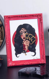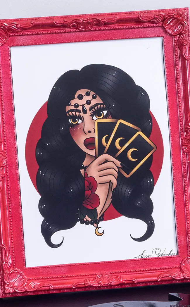 This beautiful artwork was done by Jessie Vorhees in her distinctive style. This print features a tarot reader holding her cards.