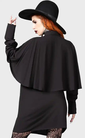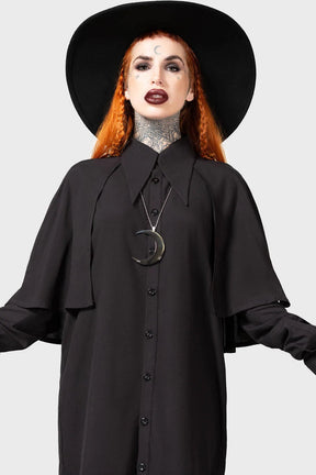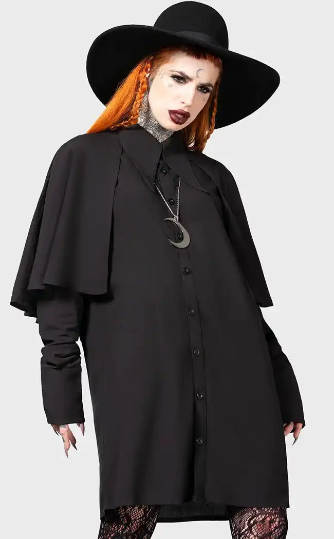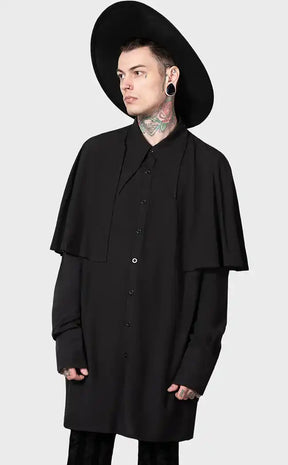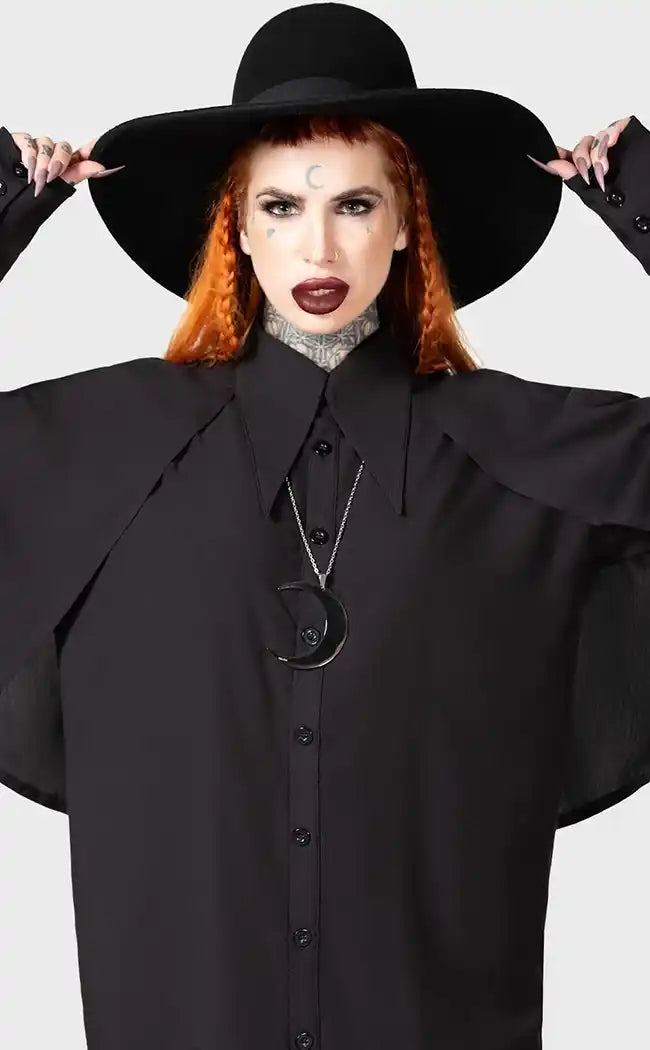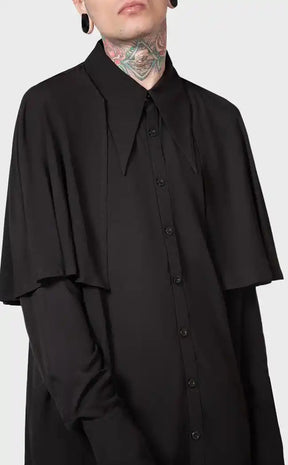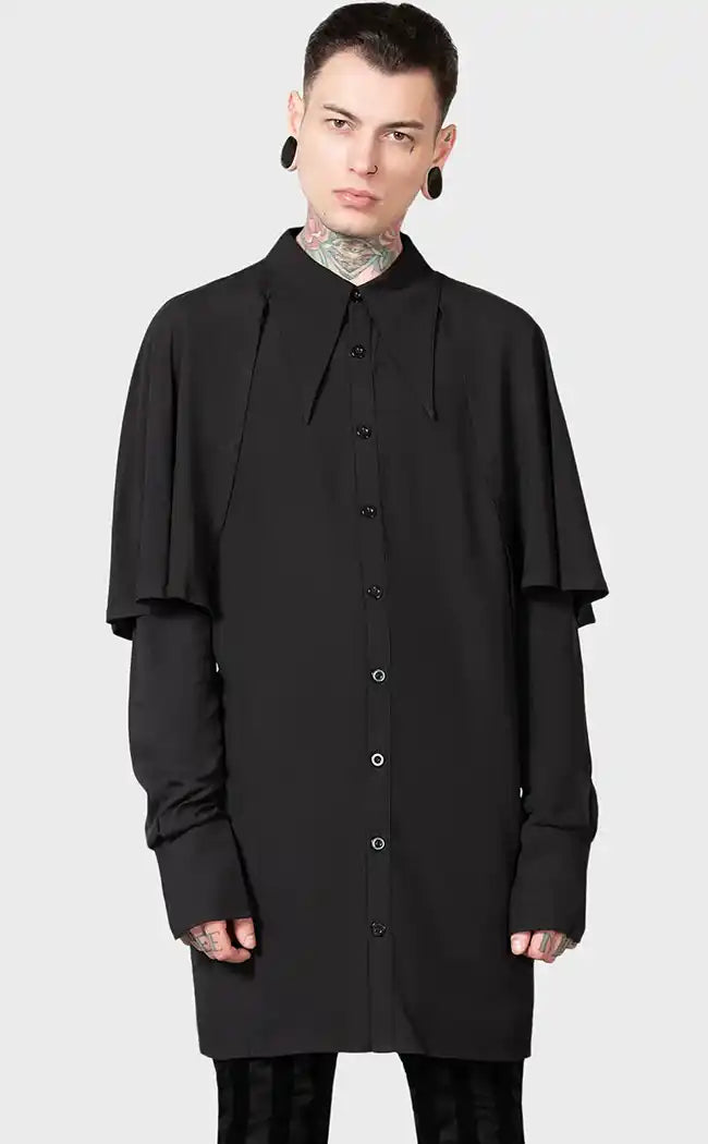 The Tenebrus Shirt by Killstar features a pointy collar, fitted shape and extra long, cuffed sleeves. The shirt gives extra drama with an attached cape to flair over your shoulders and downthe back. Made of soft viscose and closes with buttons in front. The Tenebrus shirt is unisex.