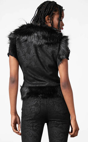 Breathtaking faux-suede covered in embossed roses, what a beauty... And it has stretch, too! Finished with pettable soft faux-fur, totally fake, of course ;) Closes with hooks in the front.