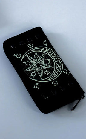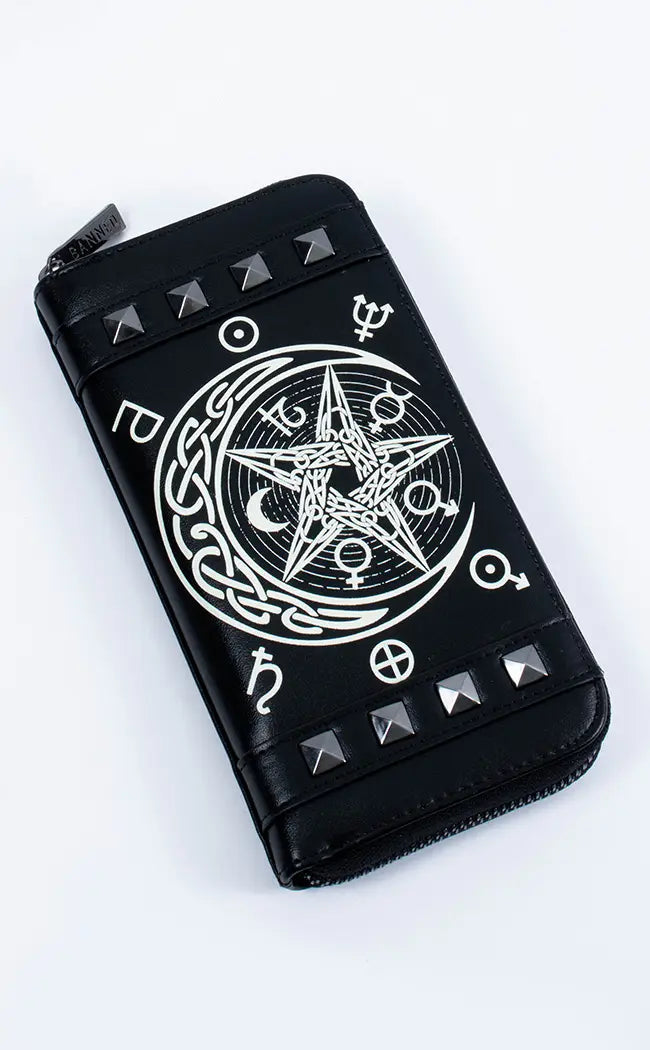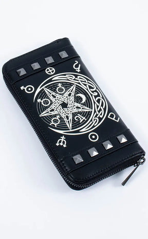 Black faux leather wallet with occult print, pyramid stud details, an outer zipped pocket and full zip closure.