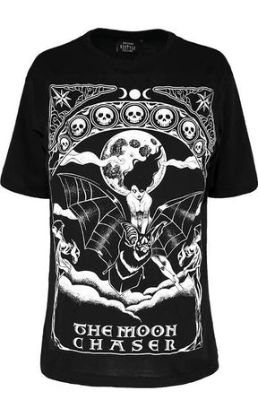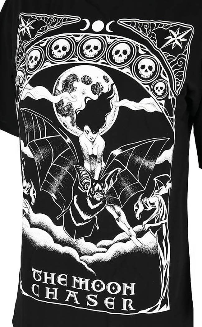 This stark, white tarot-esque print sits on an oversized black tee for slouchy, alternative vibes. Tuck into shorts or wear over maxi skirts for casual chic dripping with vampy goodness.