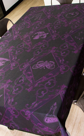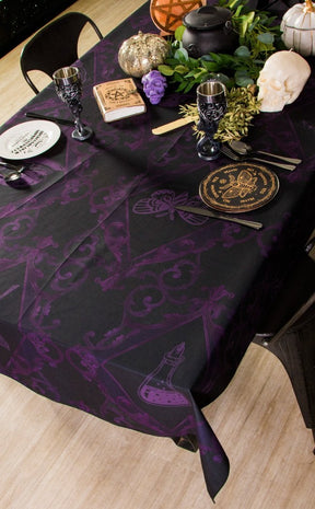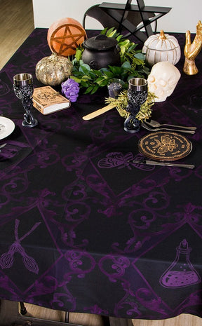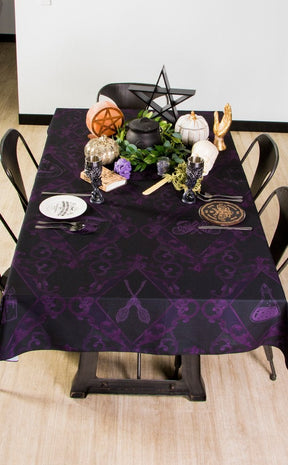 Witchy purples swirl around this inky black tablecloth, forming artwork of horror holiday favourites like cats, Jack O' Lanterns and cauldrons. Spread over your table to simultaneously brighten and darken your dining room and get everyone hungry for a wicked holiday feast!