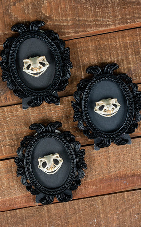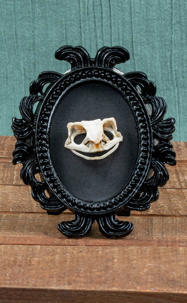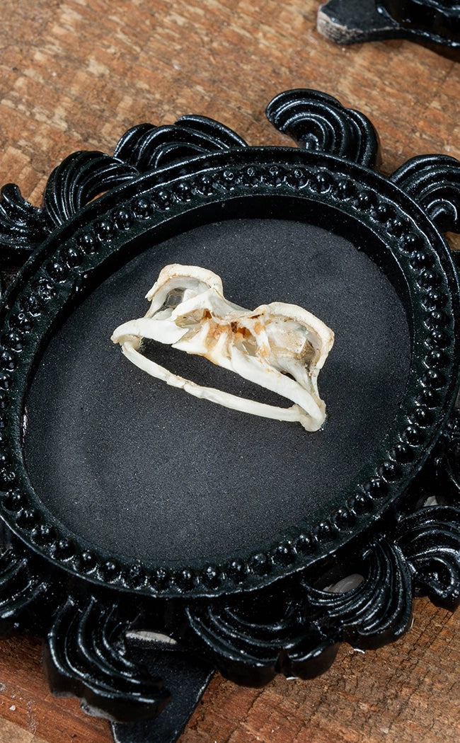 These are unique to us and very cool! Made from a cute mini resin vintage look frame, we have mounted a genuine toad skull with a matte black background. These have a stand and would look great on any curiosity cabinet.