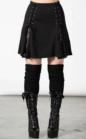 Dress yer evil dolly best in the Tragedy Ann Skater Skirt! Dripping in gothic glamour, this skirt features lace-up details, sneaky lace panels and an elastic waistband for the ultimate comfort fit. The A-line silhouette looks fantastic paired with anything from crops to bodysuits.