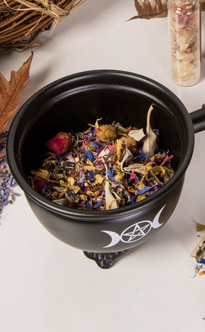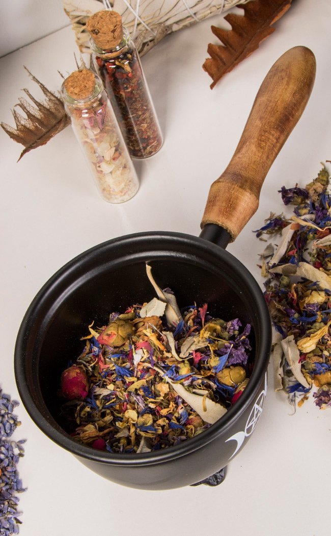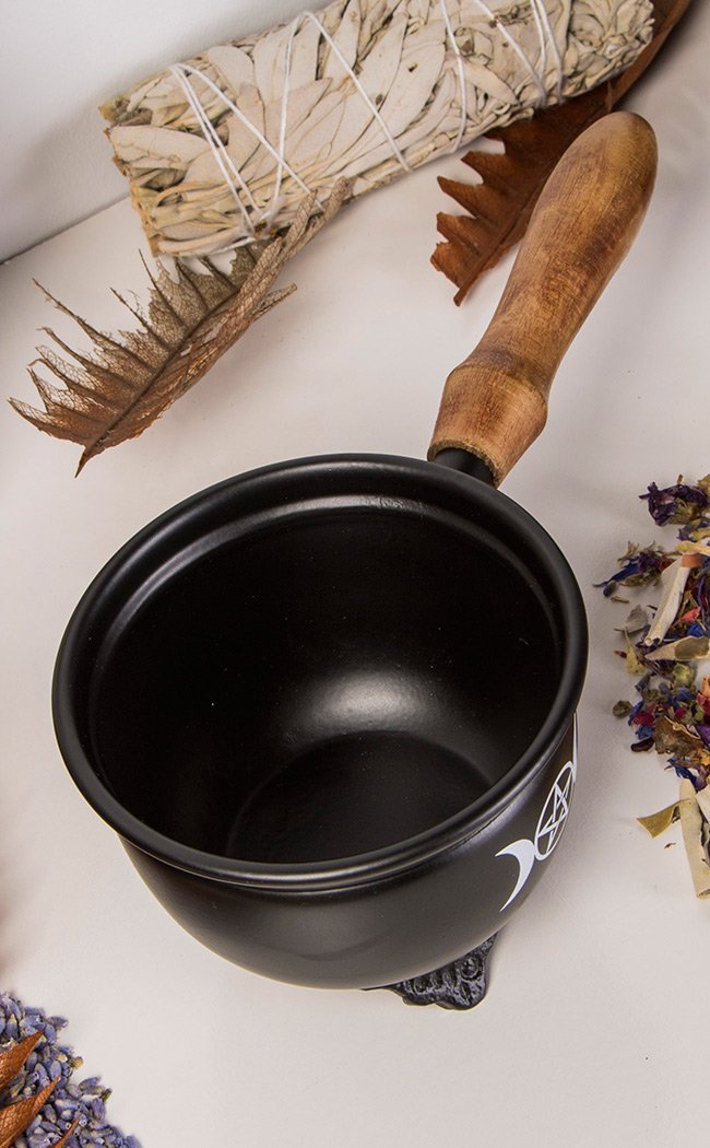 For the witch who needs to get a grip on her concoctions! This mid sized cauldron is printed with a white triple moon design atop a filigree stand. A large, polished wooden handle makes for ease of use when working with open flames or for carrying lit incense during rituals.