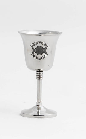 This chalice is made from stainless steel and has a triple moon design engraved on the cup.