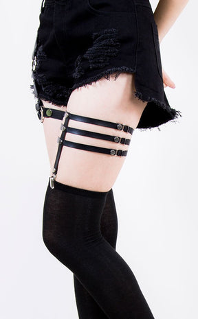 Sexy garter with faux leather triple strap and elasticated back. These garters have one clip at the front to attach to stockings and are adjustable.