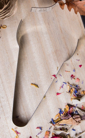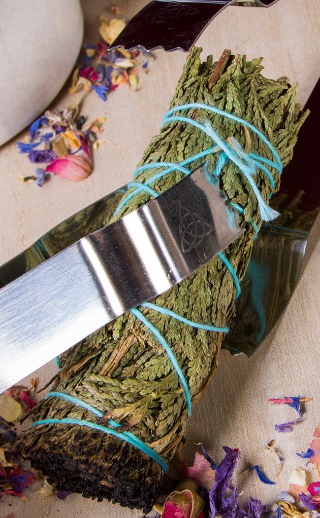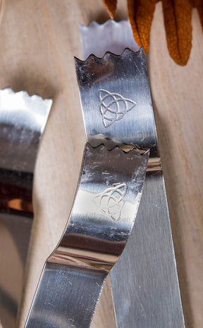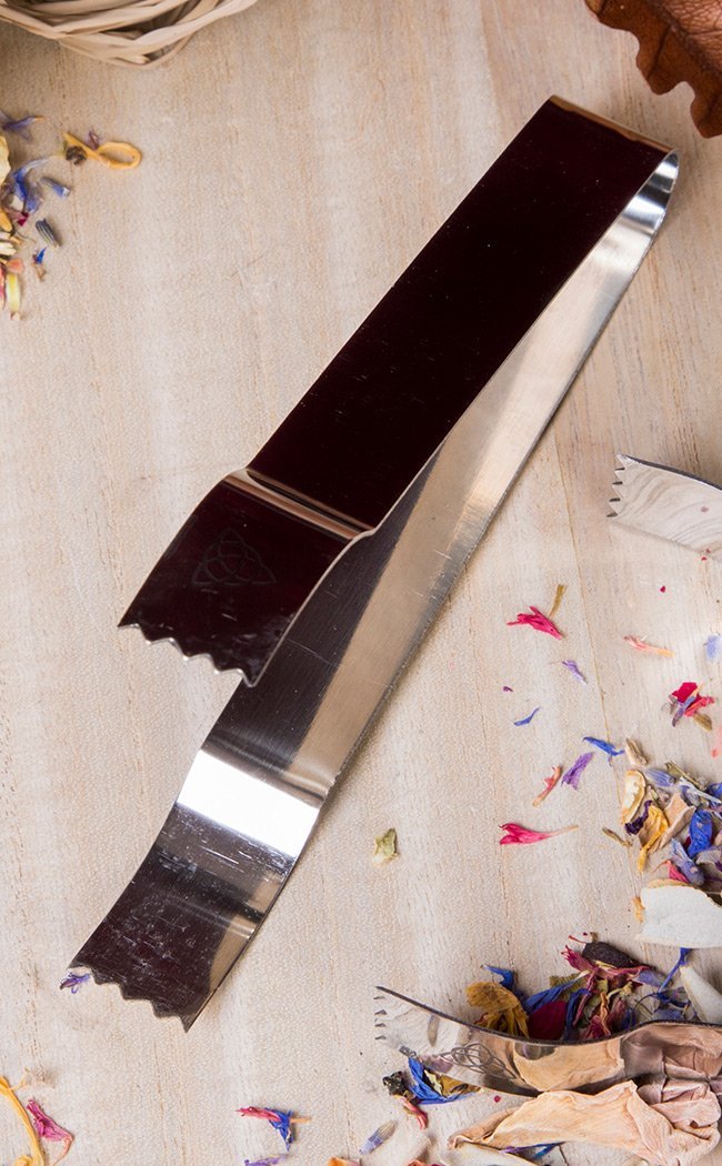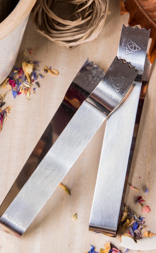 Keep your fingers safe while burning charcoal and resin incense for rituals! These tongs, etched with triquetra symbols, are perfect for placing charcoal disks in cauldrons and burners, as well as placing resin incense atop an already burning disc.
