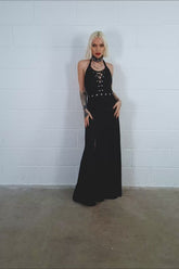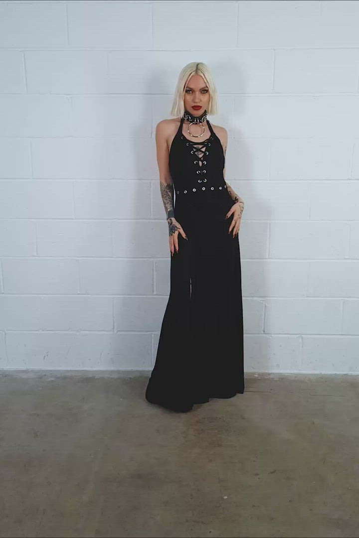 Dress yer sexy best in the Tristania Maxi Halter Dress! Soft, super-stretch fabric flows around yer bod in an A-line silhouette, fitting at the waist and securing with an adjustable D ring at the neck. The chest features a lace-up panel and a line of eyelets encircles the waist.