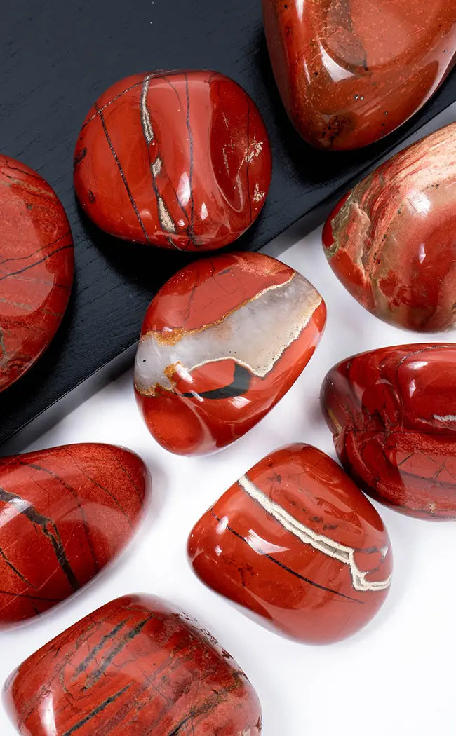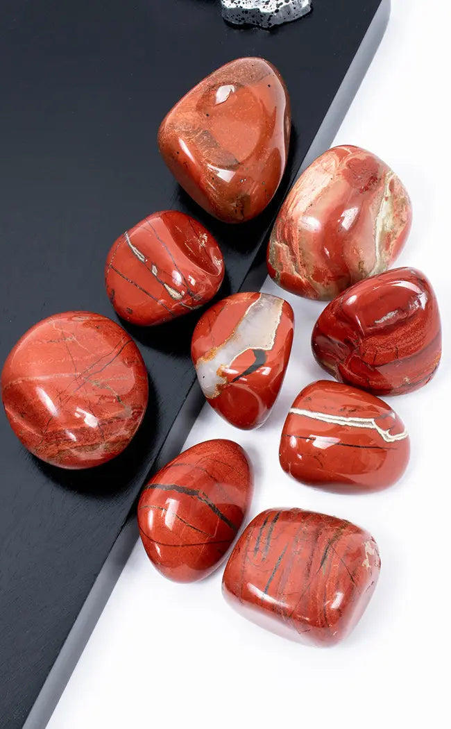 Red Jasper is also a very protective stone and can ease emotional stress. It is brimming with vitality and can aid in creativity. Red Jasper is one of the strongest Root Chakra stones. It helps to ground you and stabilize your thoughts, emotions, and aura. Red Jasper also helps to balance you and is a stone of physical strength and energy.