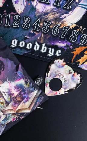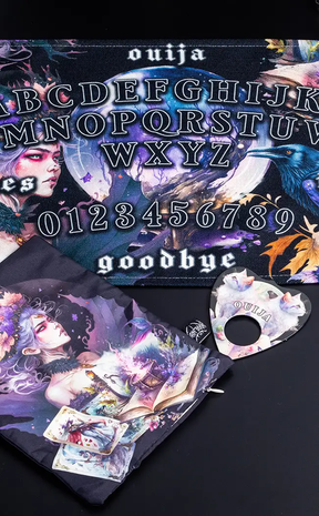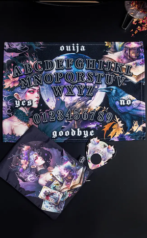 Get ready to connect with spirits from beyond the veil with the Underworld Ouija board mat, planchette, and matching protection pouch. Designed with vibrant purples and a mysterious dark witch of the underworld. Are you brave enough to cross the divide?