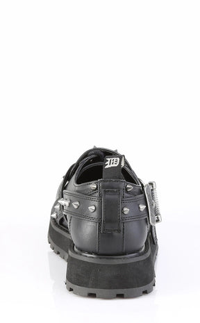 - Cone Studded Back Wrapping Buckle Strap and Cone Studded Front Shield Buckle Strap Across the Vamp