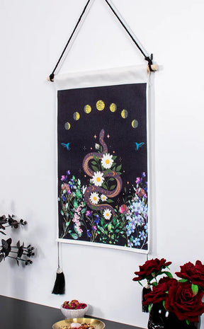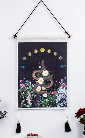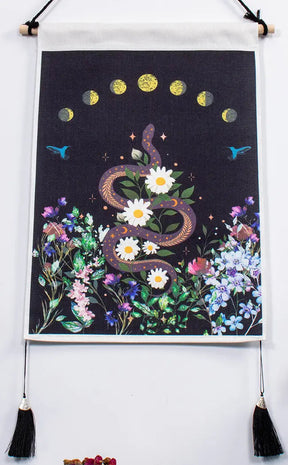 The tapestry depicts a venomous snake slithering through a vibrant and mysterious enchanted garden.