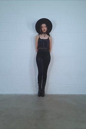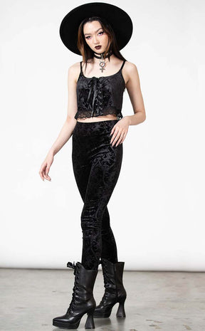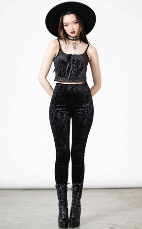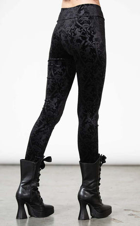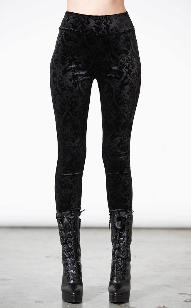 The Versilesa Leggings are your new dark n' versatile styling companion! Soft, stretch velvet is embossed with a baroque beast motif, forming a fitted silhouette and high, wide waistband.