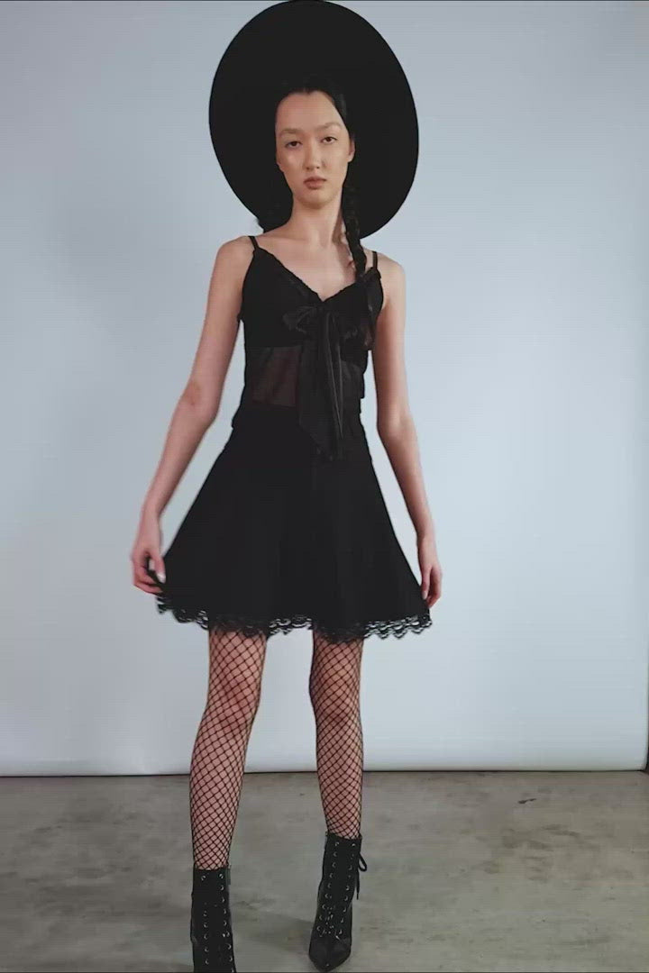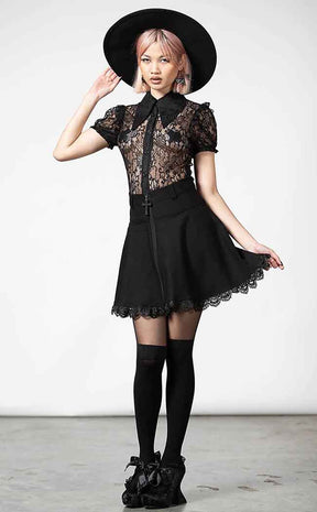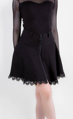 Look sugar, spice n' everything nice in the Viktoria Mini Skirt! This cutie is made with soft stretch fabric, forming an A-line silhouette trimmed with gorgeous lace. Extra deets like belt loops and a full-length zip closure topped with a cross charm elevate this skirt from your new fave to your dark wardrobe staple!