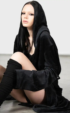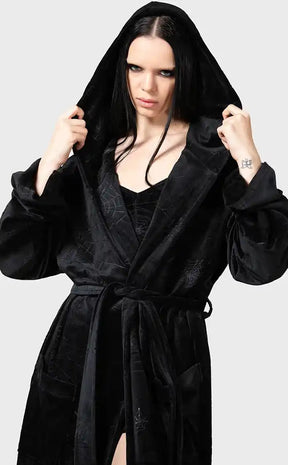 Drape your body in the softest robes after your nightly bath rituals. This super soft black stretch velour robe features an embossed spiderweb print all over and a tie front.