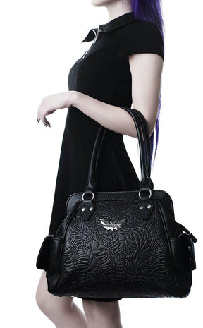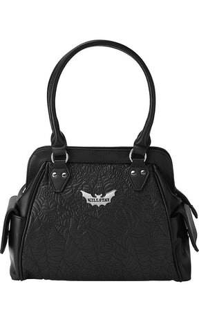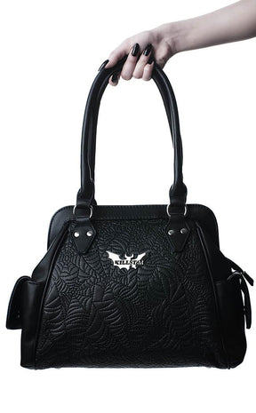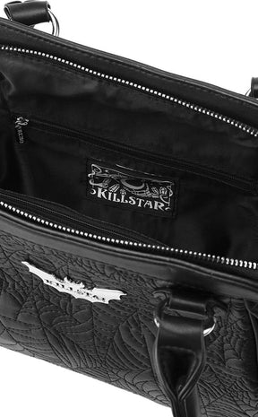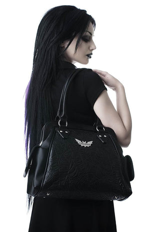 The luxe faux leather of the Webutant Handbag is embroidered with a unique webbed pattern and topped off with a spooky metal bat decal. It secures with a zip and opens to reveal multiple storage spaces and classic lining. The outer is finished with two external pockets and sturdy handles for the black widow who means business.
