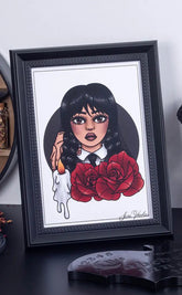 This beautiful artwork was done by Jessie Vorhees in her distinctive style. This unique portrait of Wednesday Addams with a candle and roses will add a bit of goth glam to your room.