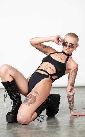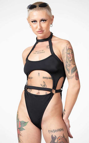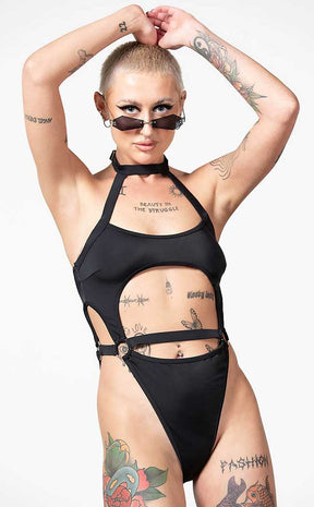 Look damn hot and make jaws drop in the Wendy Swimsuit! This sexy one-piece features statement straps, O rings, and an adjustable choker neck. The soft nylon blend stretches for a comfort fit and the chest secures at the back with a snap closure.