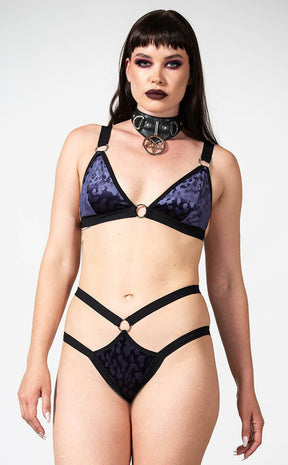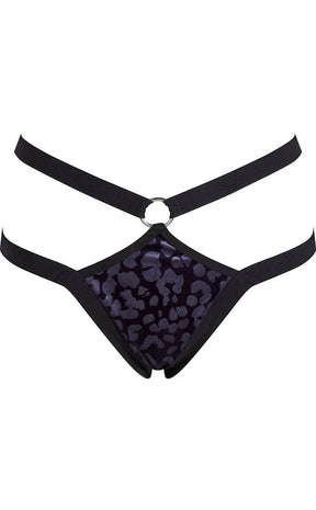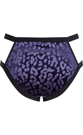 Break hearts and take over minds in the Wicked Game Panty! Soft, stretch velvet is embossed with a luxe plum purple leopard print, framed by high stretch hip straps and metal hardware.