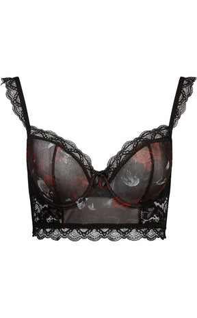 Lay yerself down in a bed of roses! The Wild Rose Mesh Bra is made from super stretch mesh, printed with a wicked motif of roses, skulls and bats. The cups have underwire for max support, the straps are fully adjustable and the whole piece comes complete with lace inserts and trims.