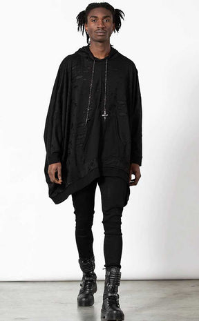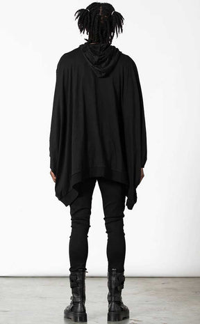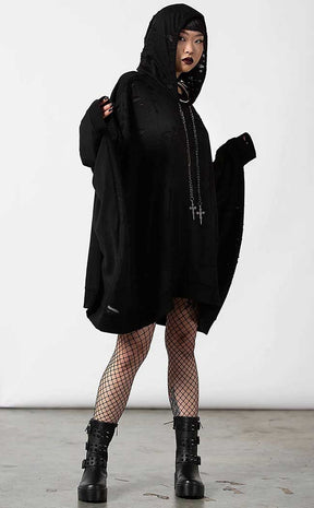 The Wings of Night Poncho will have you looking like the baddest bat around! This relaxed poncho is made with super soft fabric with distressed details that form batwing sleeves and an oversized hood. Chains with cross charms hang as mock pull tabs for an extra touch of vampire goodness.