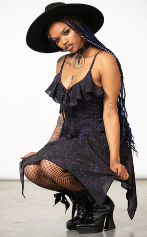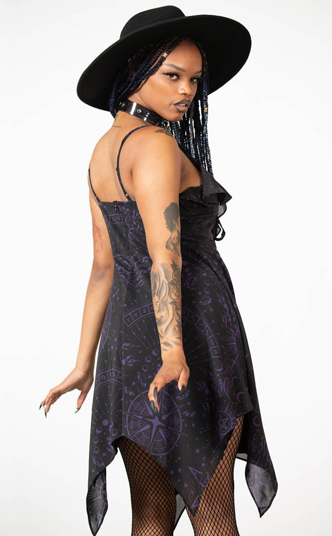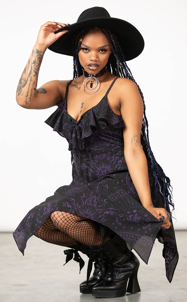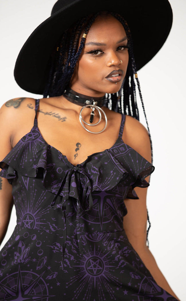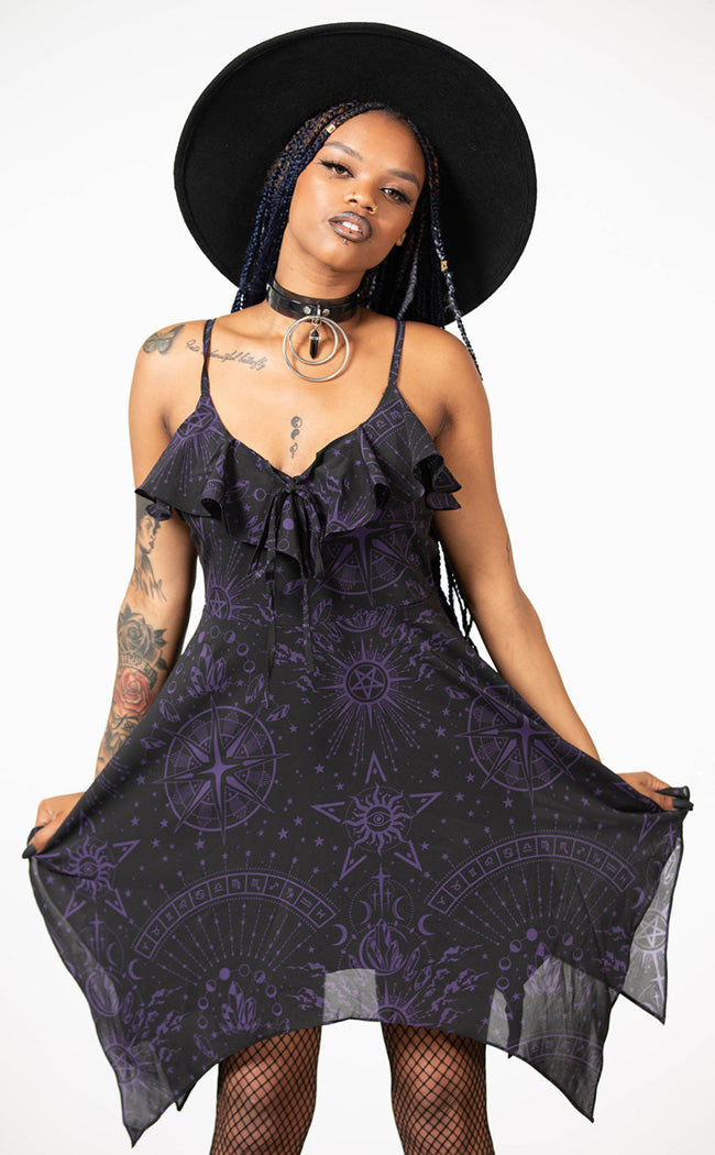Cast a spell in the Witches Finger Chiffon Dress! Soft, lightly stretchy black mesh printed with a custom celestial print to have ya feeling like a lunar goddess. This flows over an opaque slip, forming a ruffled lace-up neckline, adjustable shoulder straps and a hanky hem.