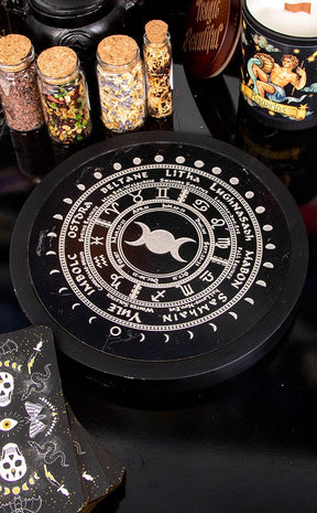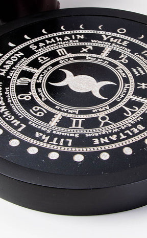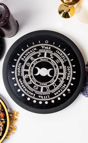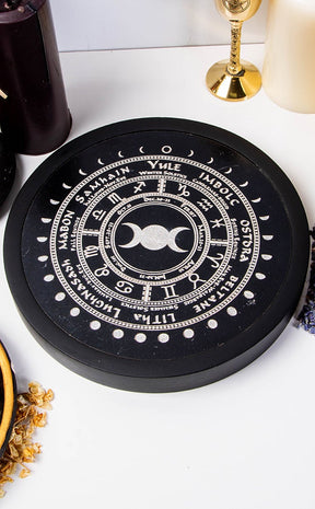 Made with hardy mango wood, this plaque features every major date in the Pagan calendar. Details are etched in silver over contrasting black, including a moon phase border and a triple moon centrepiece.