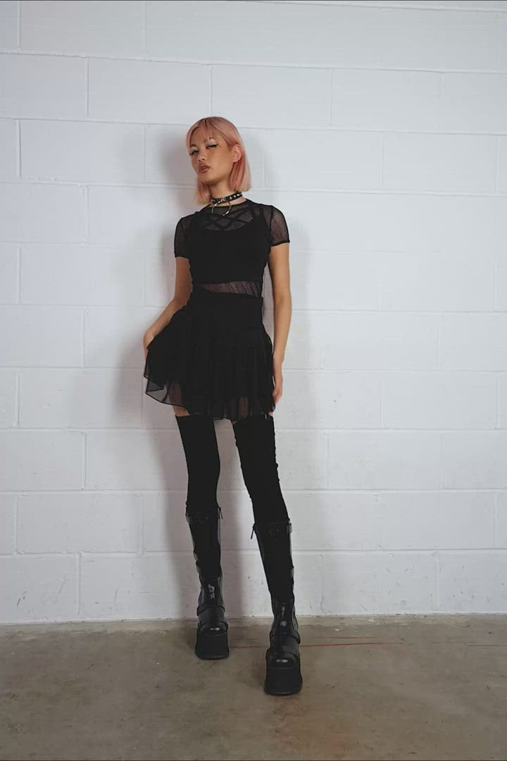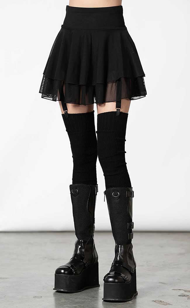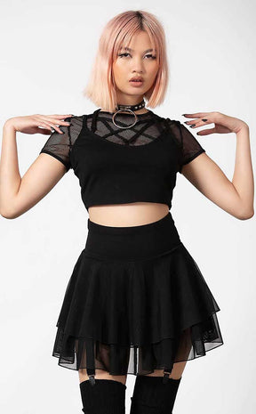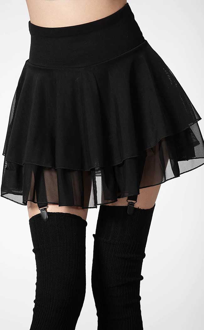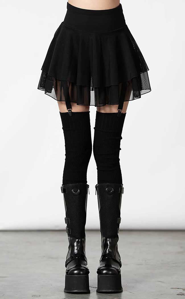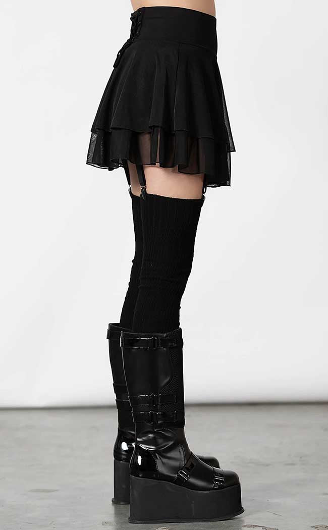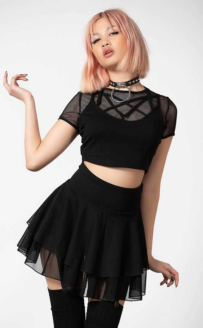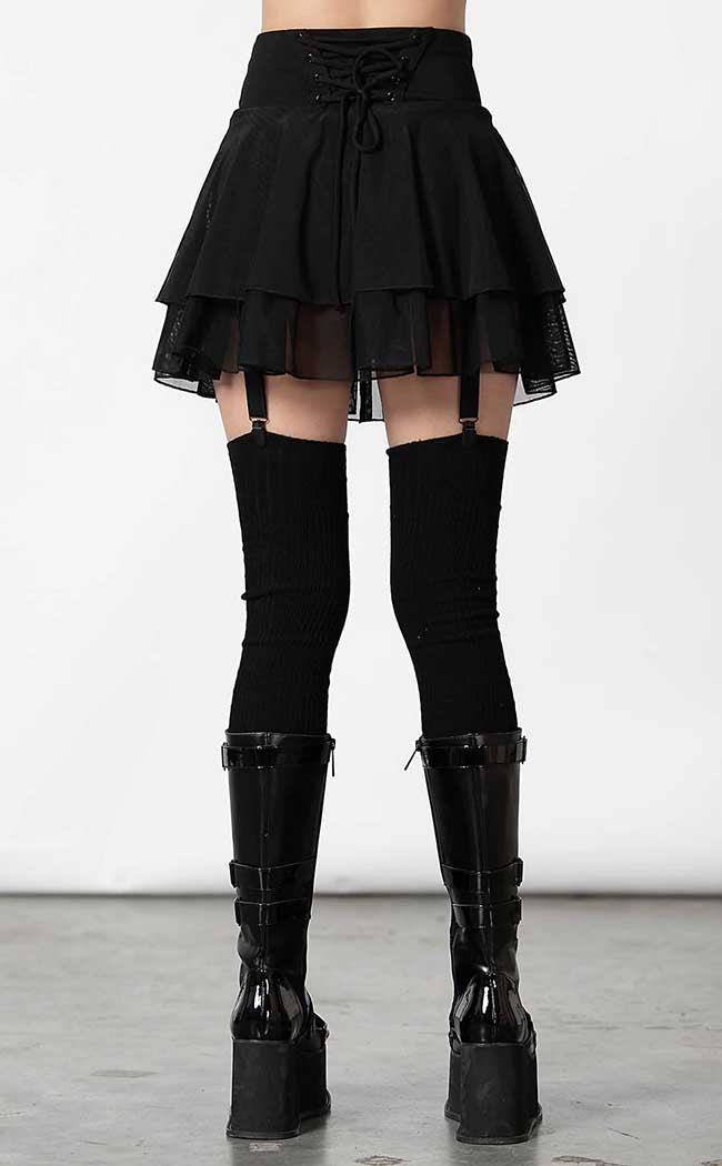 Relax n revel in yer sinful ways in the Yasumi Mesh Skirt! Soft stretch fabric flows from a high, wide waistband to form this cute layered mini-layers of mesh hide a cheeky pair of shorts and 4 adjustable suspender straps. Lace-up details at the back complete the look, making this skirt a must-have to mix n match with yer wardrobe faves.