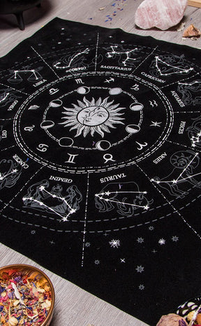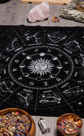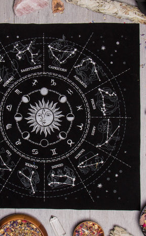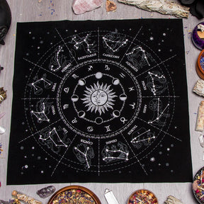 This altar cloth is stunning! Made from a soft touch yet durable material. Has a cool zodiac print in white.